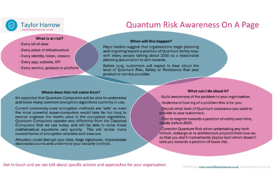 Quantum Risk? Need to build awareness in your organisation? Help yourself to our free one page PDF guide to give you an initial feel for the issues at hand. Obviously, we have loads more detailed help tailored to you.